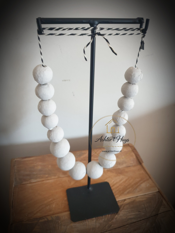 De ketting is gemaakt met cottonballs. Elk exemplaar is uniek. Een blikvanger in elk interieur.